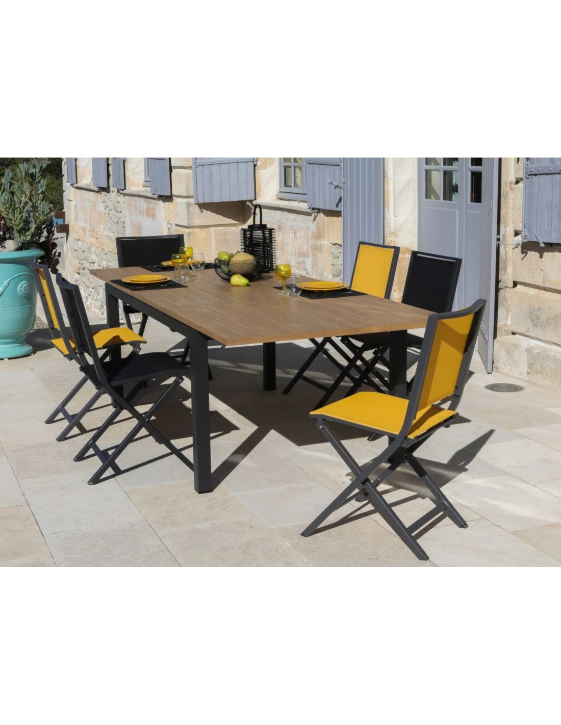Chaise pliante, légère et confortable avec un cadre en aluminium grey ou graphite et une toile tendue d’assise et de dossier au choix.