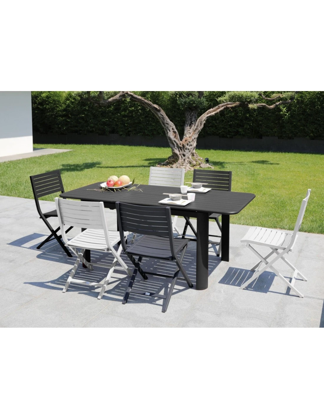 Chaise 100 % aluminium époxy, pliante à lattes disponible dans plusieurs coloris.