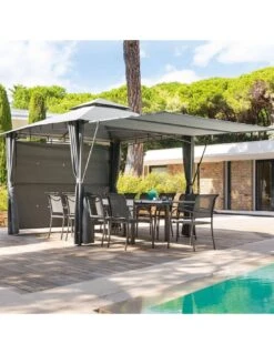 Tonnelle de jardin bien équipée avec 4 rideaux et un auvent pour vous protéger du froid et du soleil !